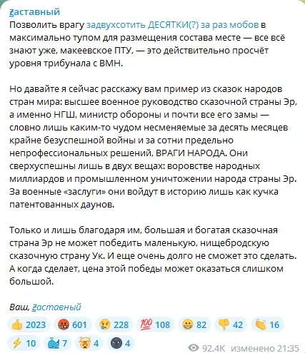 "Это катастрофа, которая имеет какую-то, неизвестную широким массам, фамилию, имя и отчество. И это тело надо наказать по итогам расследования. ВСУ действуют так, как они должны – пытаются убить наших солдат. Но их настоящий убийца – тот негодяй, который расположил бойцов так, что врагу оказалось легко расстрелять их", – написал он.
