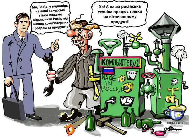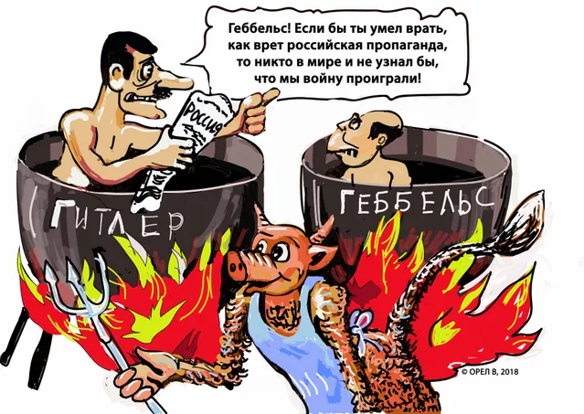 Карикатурист метко нарисовал, как кремлевской пропаганде завидуют в аду даже Гитлер с Геббельсом. Однако сами россияне только этой ложью и могут гордиться, так как все остальное у них – остатки из Советского Союза.