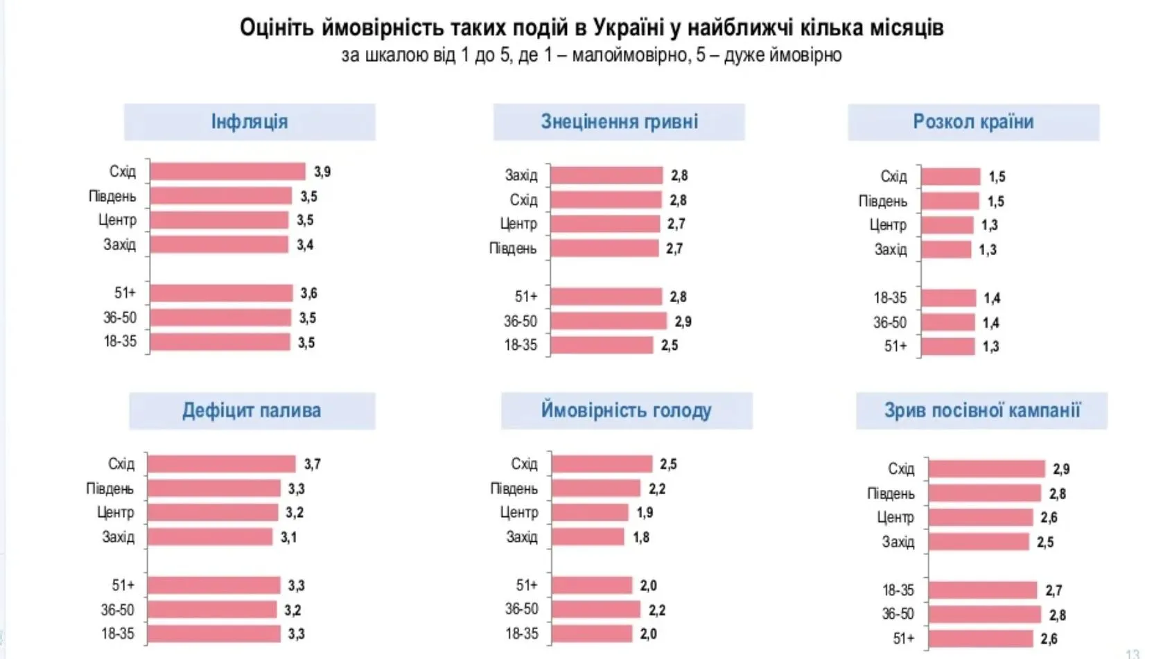 Обесценивание гривны и срыв посевной кампании считают вероятным не более четверти опрошенных, голод – 13%. Жители восточных регионов несколько больше боятся наступления упомянутых угроз, чем жители других макрорегионов,