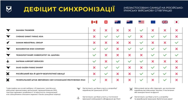 Результаты исследования демонстрируют значительные расхождения между западными партнерами. К примеру, ограничения в отношении иранской компании Sahara Thunder, которая контролируется Минобороны Ирана и участвовала в соглашении по производству "Шахедов" на территории России, ввели только Соединенные Штаты.