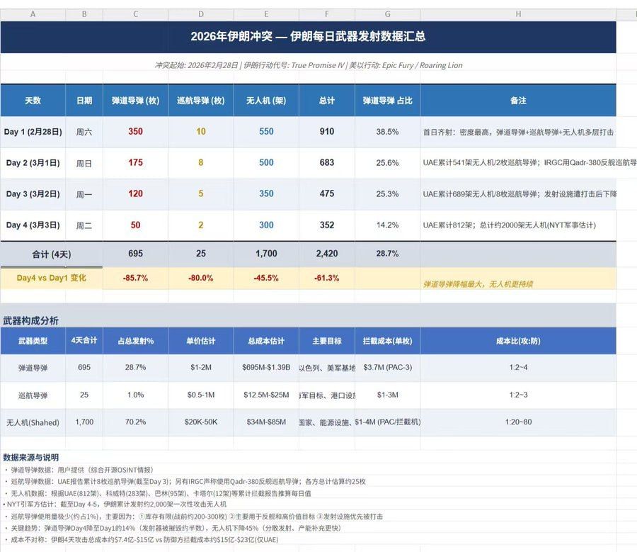 В Китае активно следят за статистикой иранских ударов. Отслеживают типы ракет, количество, стоимость перехвата. Уже опубликовали первую табличку с данными.