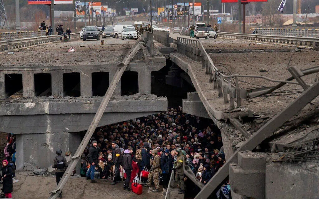 Эвакуация из Ирпеня возможна только пешком. Большое количество людей скопилось под мостом и ждет шанса убежать от обстрелов оккупантов.
