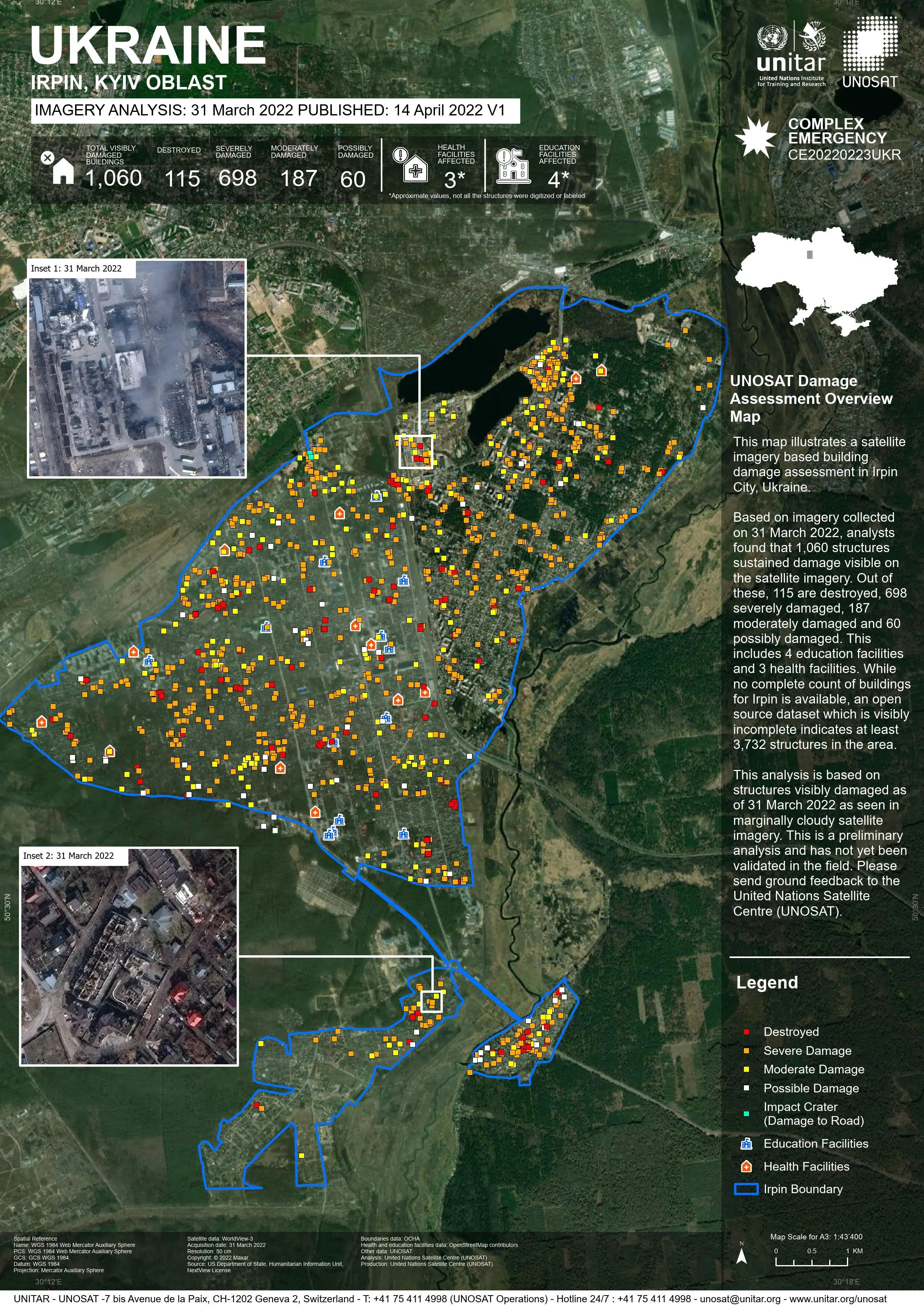 На основе сделанных спутниковых снимков аналитики ООН Unosat подсчитали примерное количество разрушенных и поврежденных построек в Ирпене.