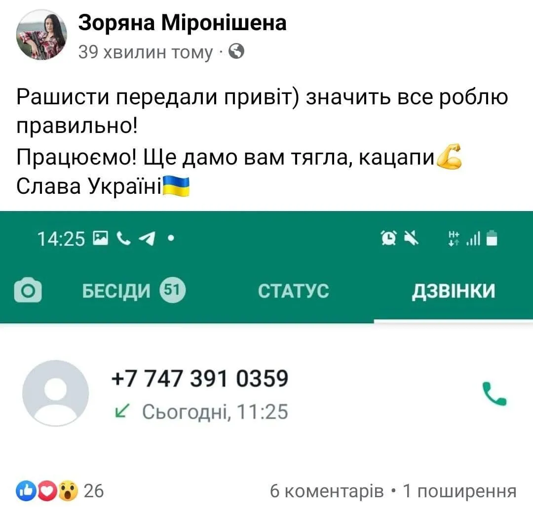 Номер оккупантов / Скриншот с фейсбук-страницы Зоряны Миронишеной
