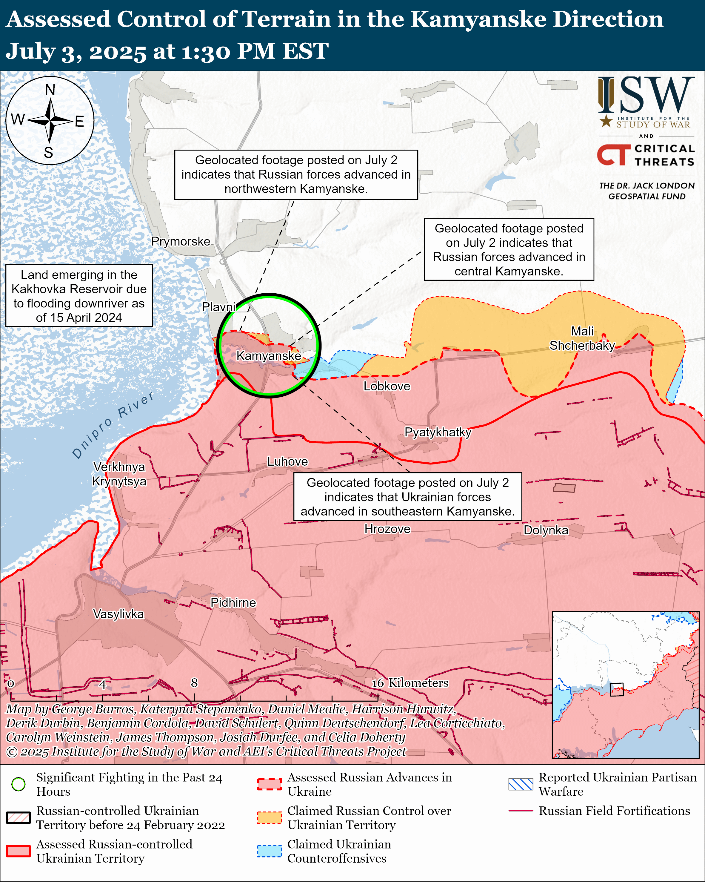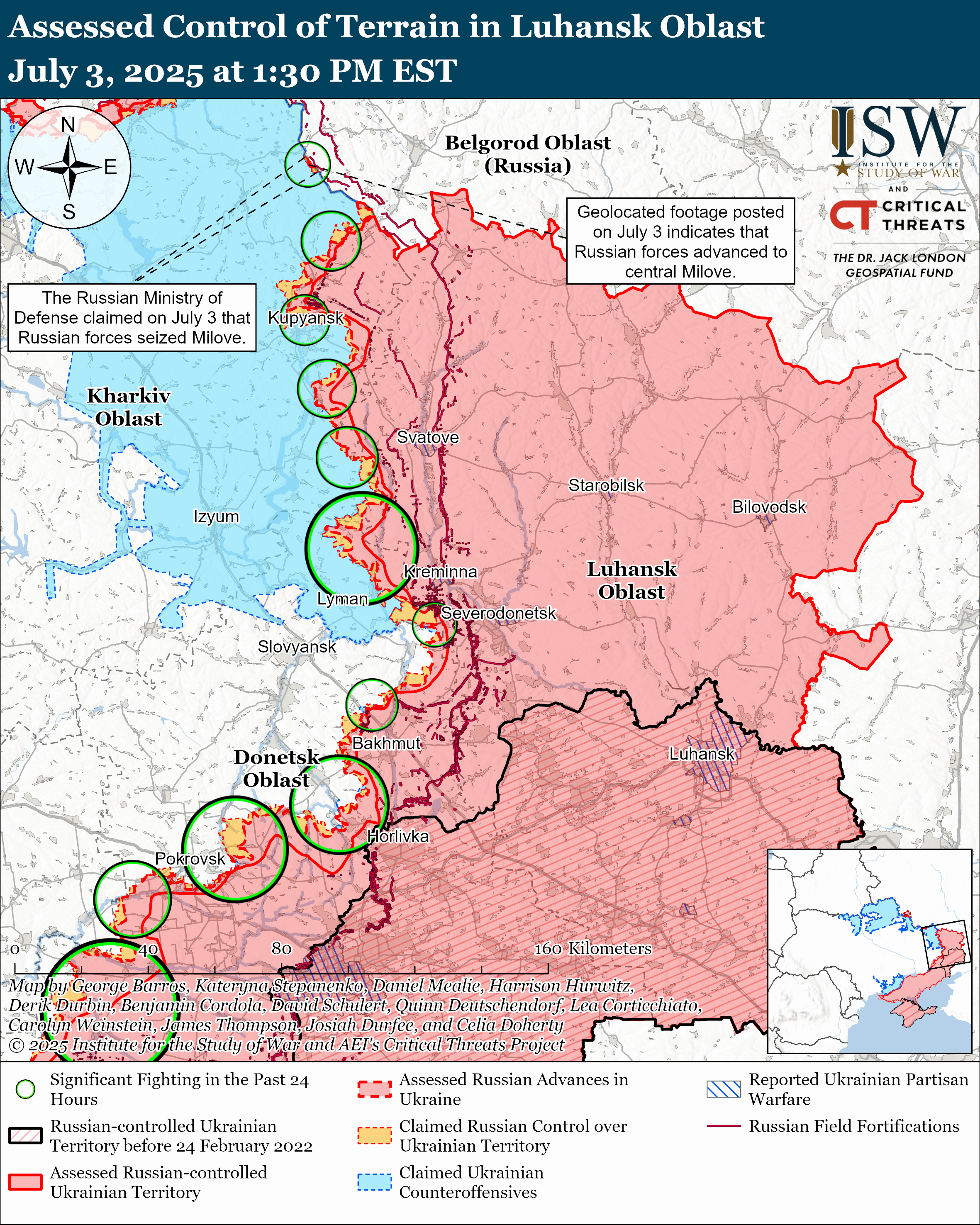 - Российские войска продвинулись на Купянском направлении. Геолокационные видеозаписи от 3 июля свидетельствуют, что они прошли в центральную часть Мелового, что к северу от Купянска вблизи границы. Но ISW не может подтвердить, удерживают ли они там устойчивые позиции.