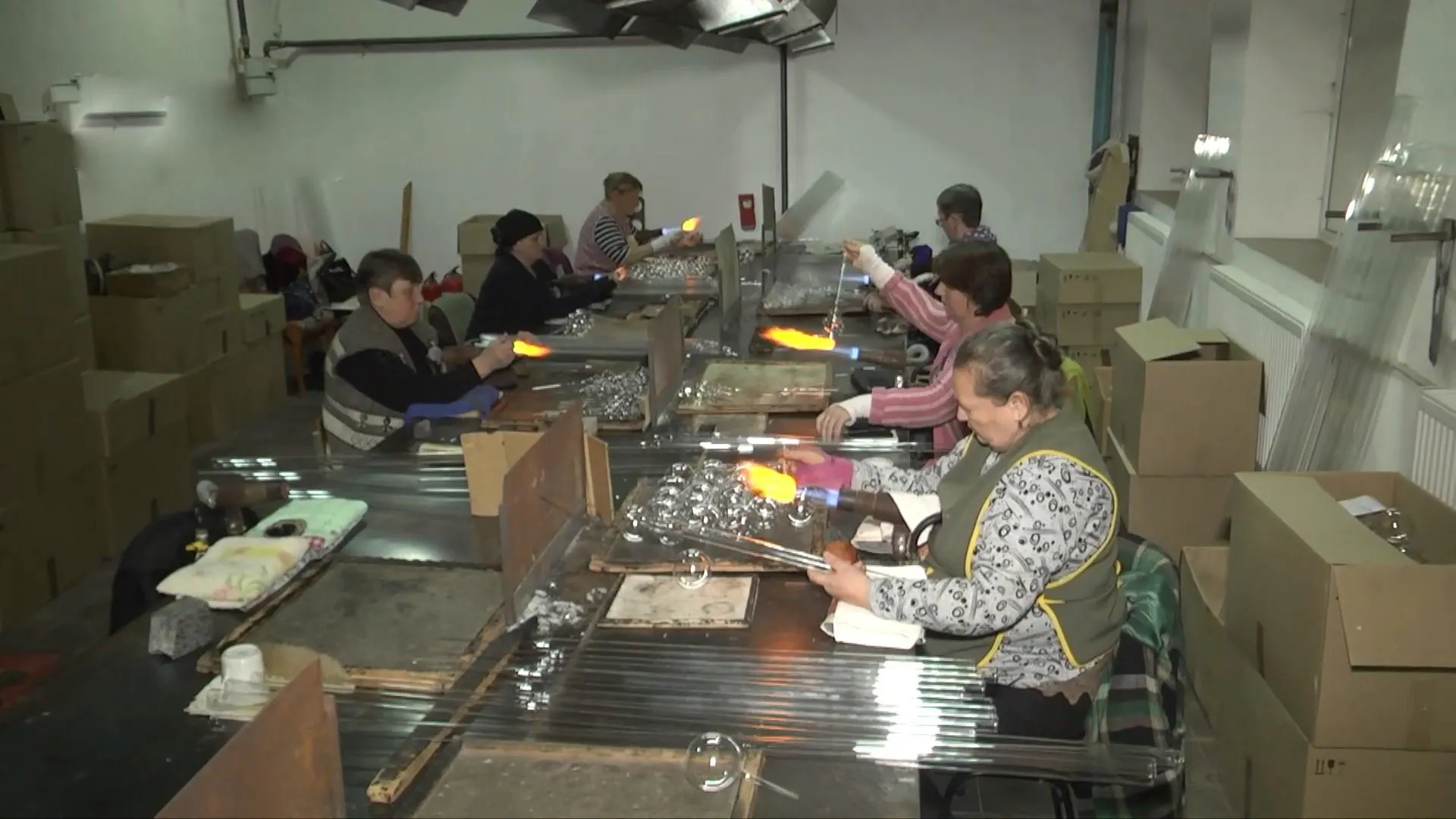 Многие работники в цехе занимаются изготовлением елочных украшений уже больше 20 лет. Они делятся: сперва каленое стекло нужно выдуть до нужной формы всего за 3 секунды, потому что плавится оно при 1000 градусов. Его нужно расплавить равномерно, чтобы выдуть или забросить в форму.