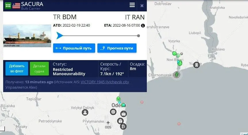 В Мининфраструктуре Украины заявили, что MV Sacura – первое судно, отправившееся из порта "Южный" с 24 февраля.