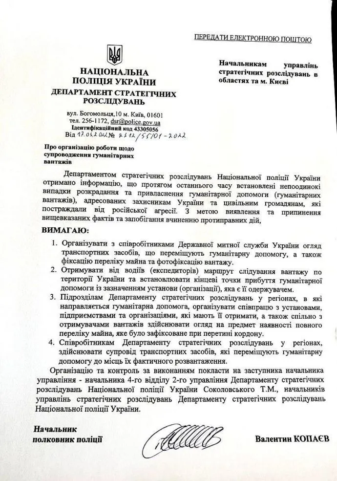 Об этом говорится в письме начальника департамента стратегических расследований Нацполиции Валентина Копаева начальникам управлений стратегических расследований.