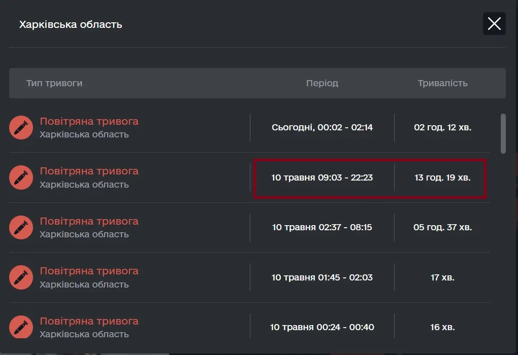 Воздушная тревога в Харьковской области 10 мая была самой длинной за все время войны России с Украиной. Об этом свидетельствуют данные официальной карты воздушных тревог.