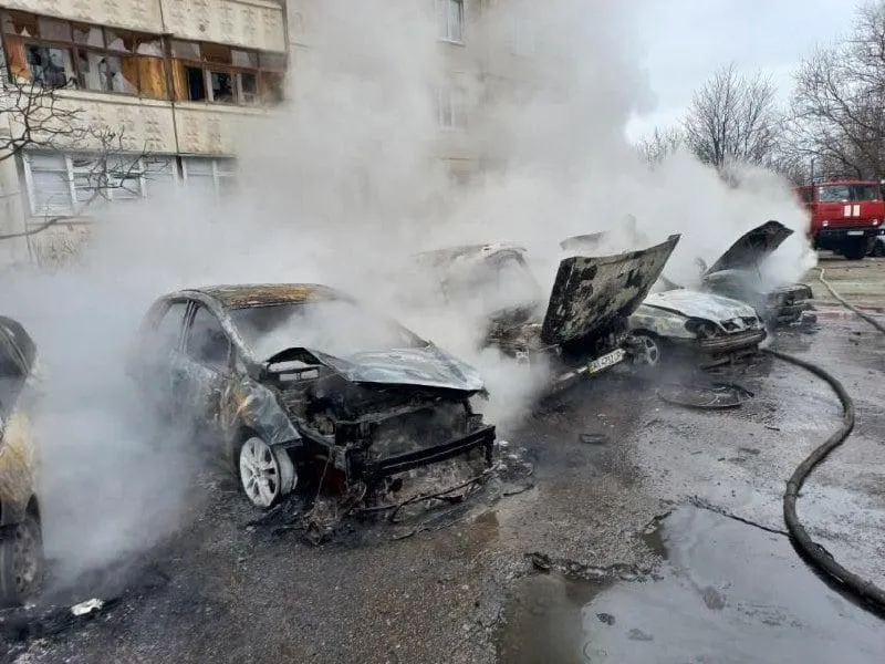 Спасатели ликвидировали пожар. В результате обстрела сгорели 5 легковых автомобилей.