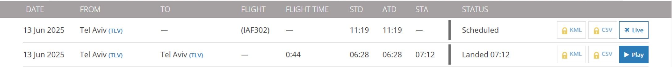 - Этот самолет, Boeing 767-338/ER или Wing of Zion, вылетел из аэропорта Бен-Гурион и вернулся после полета над Средиземным морем 13 июня, но официальных комментариев относительно его маршрута не было.