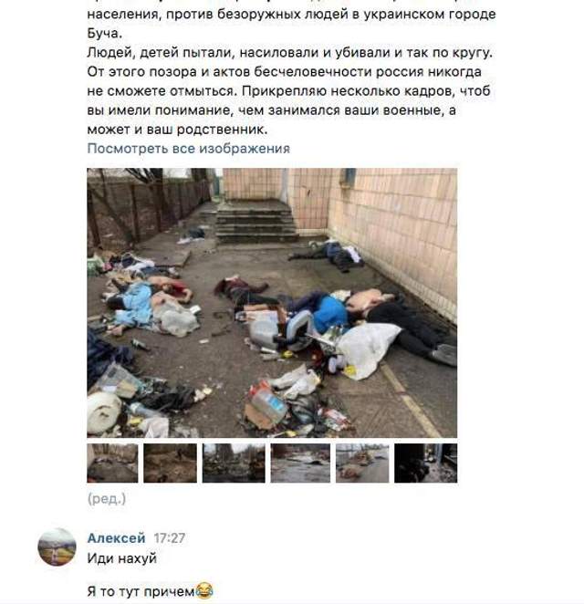 С помощью искусственного интеллекта в Минцифре нашли родственников российских извергов, которые вышли из Киевской области и оставили после себя огромное количество доказательств ужасных военных преступлений. В соцсети им направили фото и сообщения с правдой о зверствах их близких на территории Украины. Реакции на увиденное уже даже не удивляют: