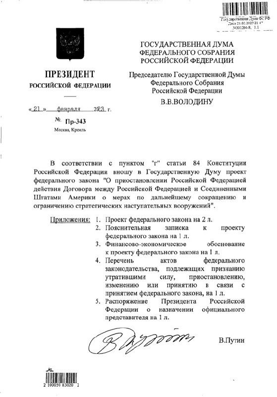 "Путин внес в Госдуму проект о прекращении участия в ДСНВ. Проект закона Госдума рассмотрит в среду (22 февраля – 24 Канал)", – добавил Володин.