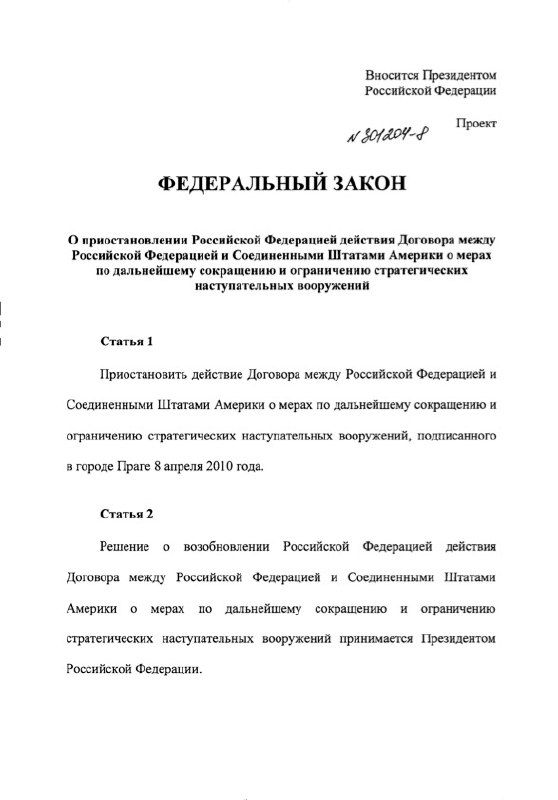 Путин внес в Думу законопроект о приостановлении участия в ДСНВ