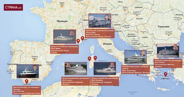 Яхта владельца торговой марки "Наша ряба" Юрия Косюка плывет по маршруту Ницца – Мез (городок во Франции – "24"). А лодку, которой по данным СМИ, владела семья Виктора Януковича, нашли в Гибралтаре.