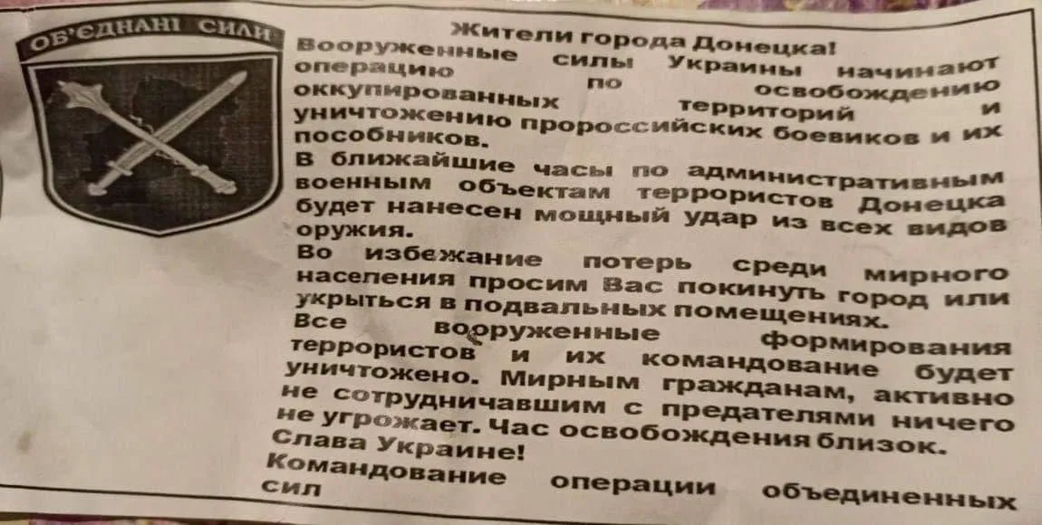 Однако в листовке говорится, мол, ВСУ начинают "операцию по освобождению оккупированных территорий и уничтожению боевиков". Злоумышленники распространяют ложь, якобы вскоре по военным объектам террористов нанесут удар. Мирных жителей просят спрятаться в подвалы.