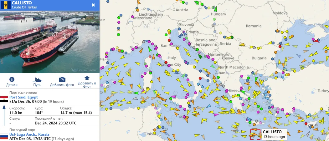 Отследить, откуда и куда направляется "теневой" танкер, вообще не является проблемой. Например, чтобы установить, что CALLISTO с IMO 9299692 движется из порта Усть-Луга (один из крупнейших по показателям экспорта российской нефти) в Саид в Египте, понадобилось чуть менее 30 секунд.