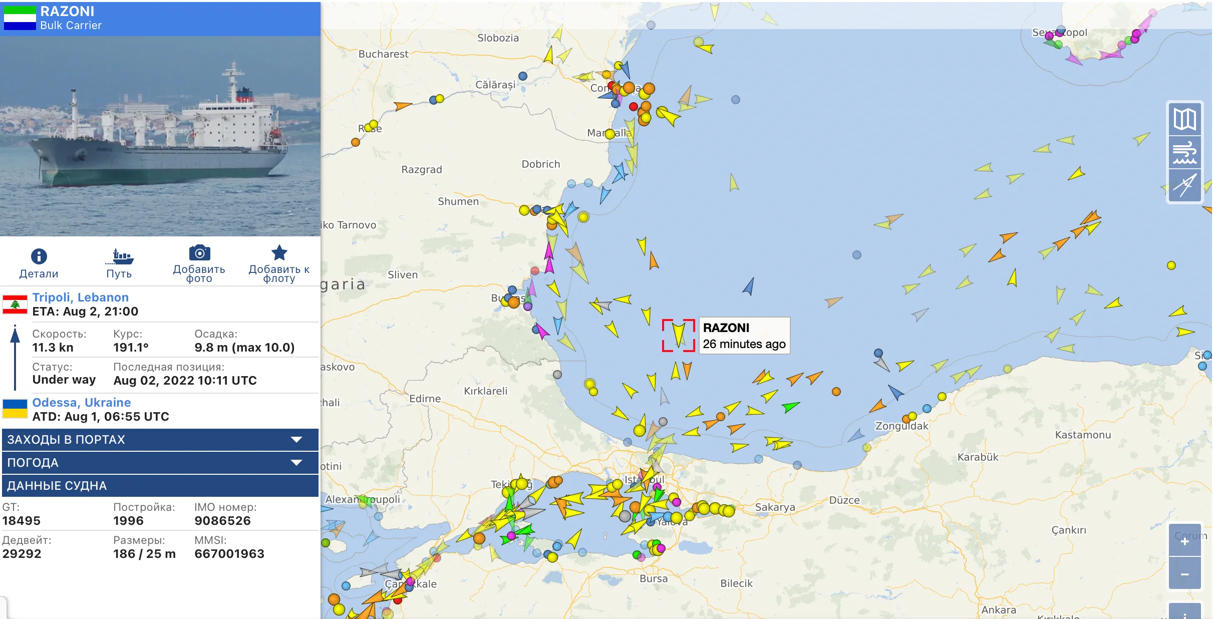 Ожидается, что судно под названием RAZONI, которое мы ожидали, и следили за ним раньше, станет на якоре в городе Стамбул в полночь... Грузовое судно вышло из украинского порта "Одесса" в Ливан. Ход этого судна планировался нашим центром и продолжает отслеживаться,