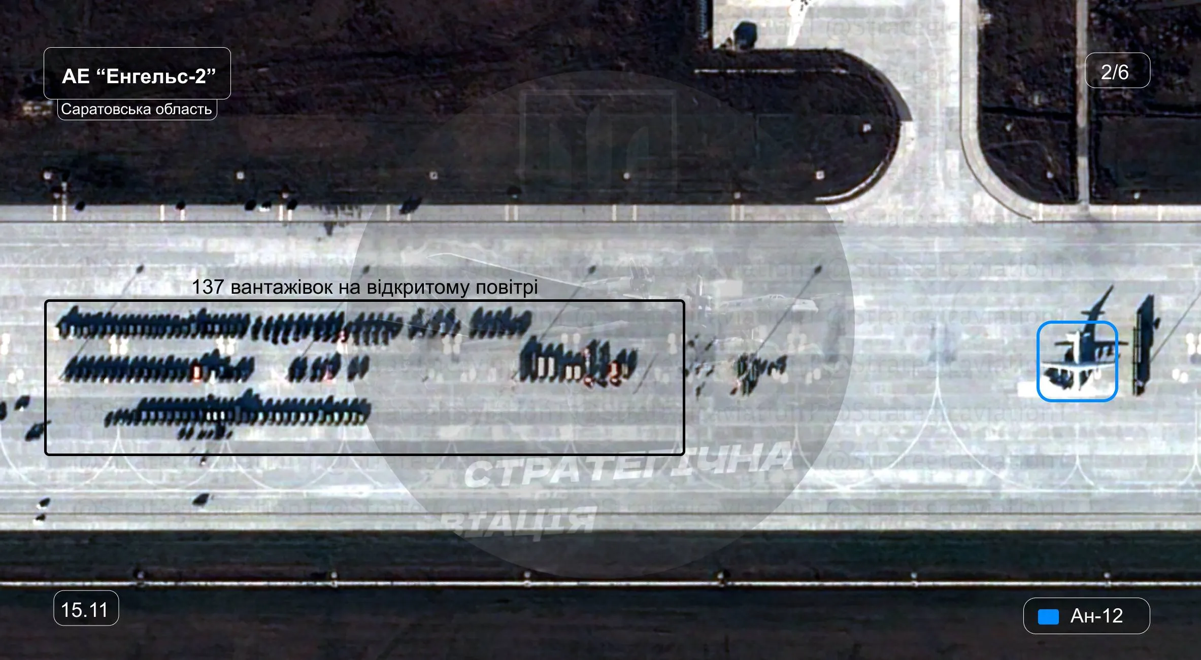 На кадрах со спутника за 15 ноября впервые зафиксировали 137 грузовиков на российской авиабазе "Энгельс-2" в Саратовской области. Согласно снимкам, вся техника расположена на стоянке для самолетов. Рядом с ней также видно транспортный Ан-12.