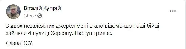 Пост Виталия Куприя о занятых улицах в Херсоне / Скриншот 24 канала