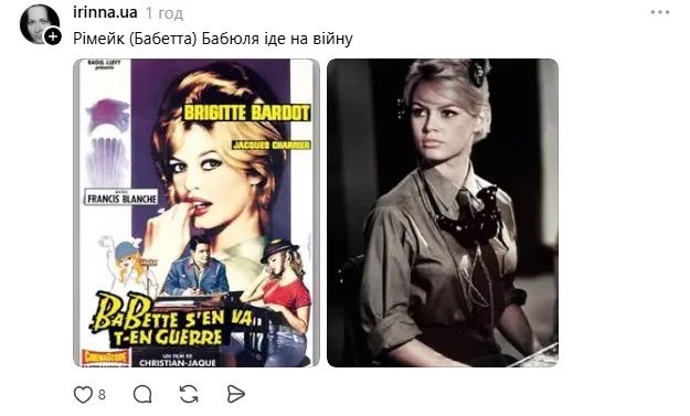 В сети Юлию Владимировну также сравнивали с героиней фильма "Бабетта идет на войну" 1959 года, в котором сыграла покойная французская актриса Брижит Бардо.