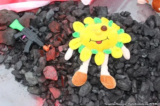 В частности, активисты принесли уголь и детские игрушки, которые полили "кровью".