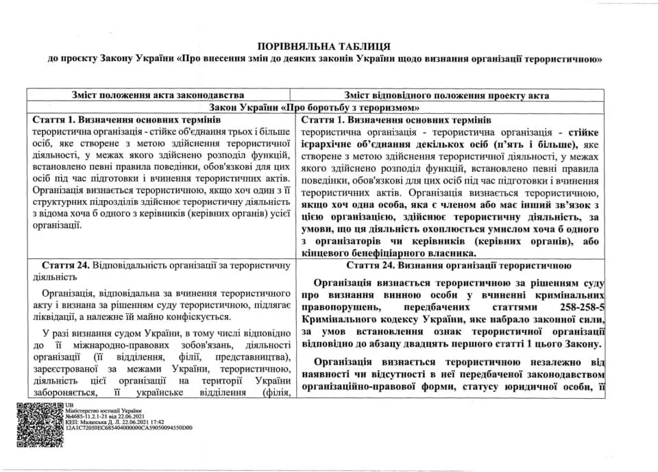 Организация признается террористической, если хоть одно лицо, которое является членом или имеет другую связь с этой организацией, осуществляет террористическую деятельность, если эта деятельность охватывается умыслом хотя бы одного из организаторов или руководителей, или конечного бенефициарного владельца,