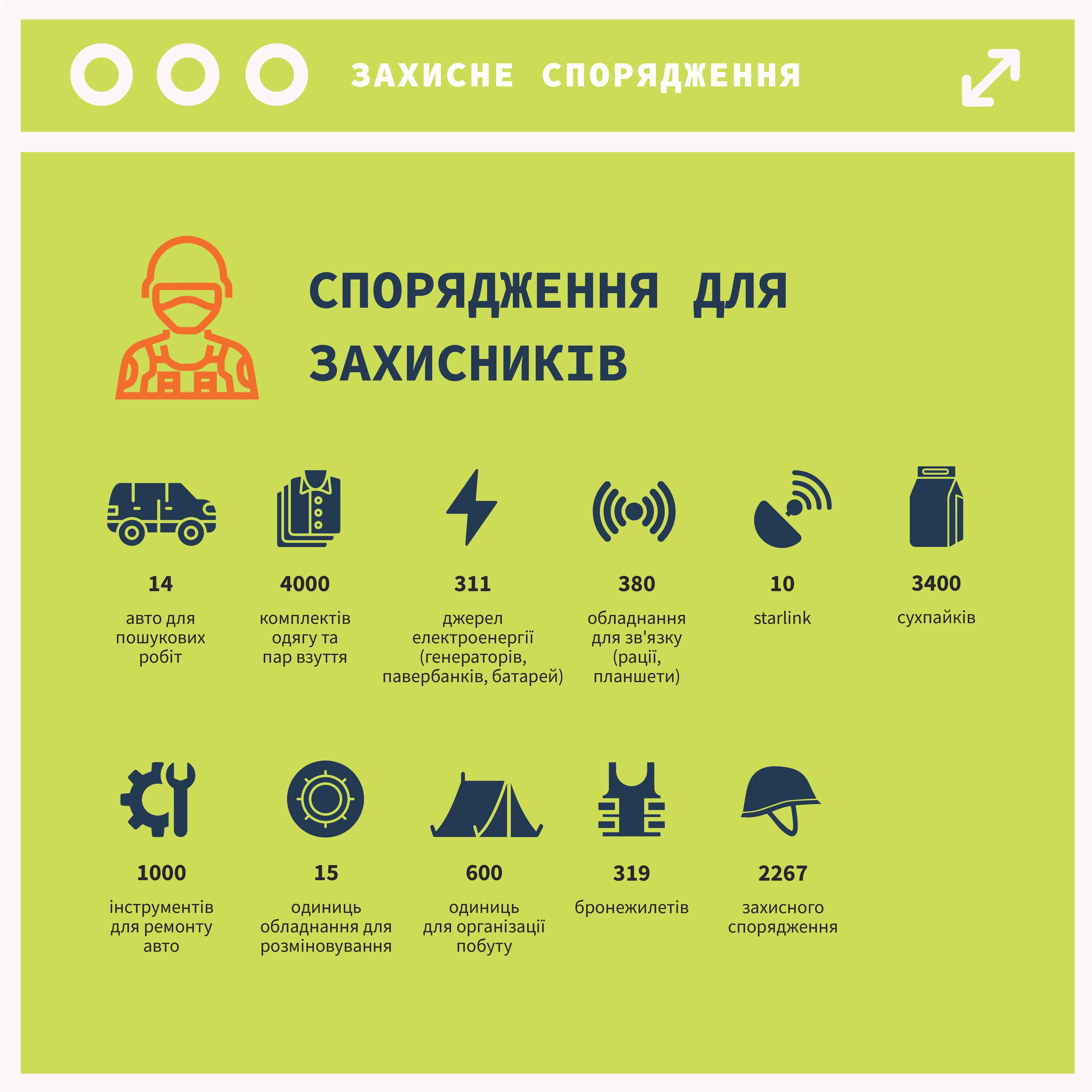 - Защитное снаряжение и специальное оборудование почти на 26 миллионов гривен для защитников. Средства были направлены на закупку эвакуационных автомобилей, одежду и обувь, каски и бронежилеты, оборудование для разминирования территорий.