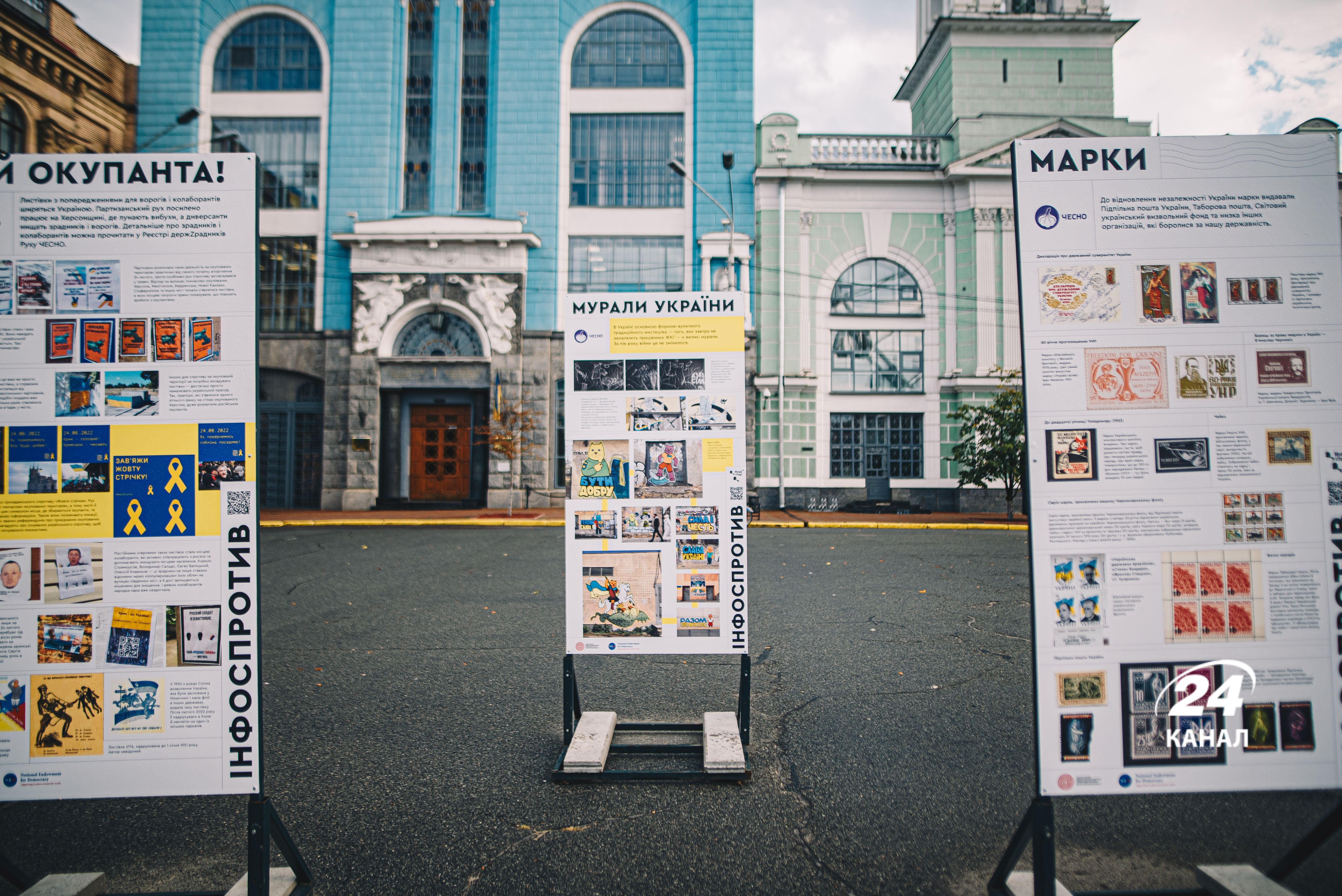 У выставки довольно интересное сочетание, где организаторы провели параллели между происходящим в Украине сейчас и что было в начале 20-го века. Центральным экземпляром стала большая фотозона с украинской маркой, анонсированной генеральным директором "Укрпочты" Игорем Смилянским. На эскизе изображены девушка и парень, которые наблюдают за тем, как взрывается Крымский мост через Керченский пролив.