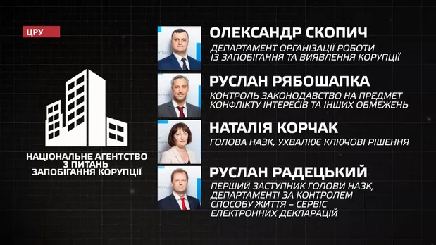 Национальное агентство по вопросам предотвращения коррупции как коллегиальный орган имеет 4 руководителей, которые гарантируют независимость антикоррупционной структуры. Каждый из руководителей организации отвечает за отдельное звено. В частности, Александр Скопич контролирует работу Департамента организации работы по предотвращению и выявлению коррупции, Руслан Рябошапка отвечает за контроль законодательства на предмет конфликта интересов и других ограничений. Возглавляет НАПК Наталья Корчак, которая принимает ключевые решения. Заместитель председателя организации Руслан Радецкий – ответственный за контроль сервиса е-деклараций.