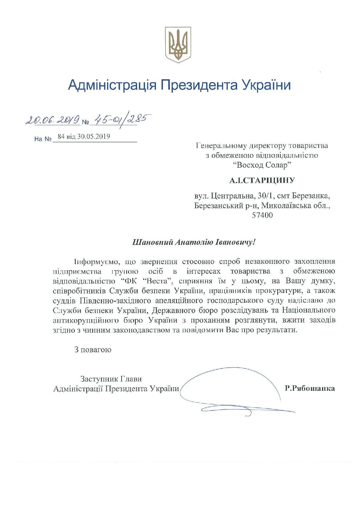 Также Анатолий Старицын передал изданию копию ответа Администрации Президента на обращение "Восход Солар". В документе, в частности, сказано, что обращение передано в СБУ, Государственное бюро расследований и НАБУ с просьбой рассмотреть и принять меры в соответствии с действующим законодательством.