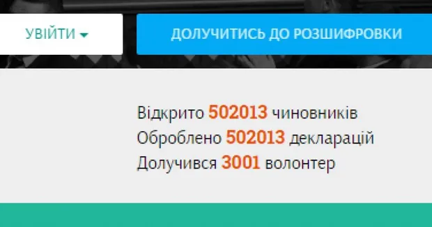 Декларации – это проект ОО "Канцелярская сотня", что електронизует декларации чиновников и создает удобные аналитические инструменты для журналистов и общественности. Кроме обработки новых электронных деклараций, команда проекта переводит в электронную форму бумажные декларации чиновников за предыдущие периоды, чтобы отслеживать их состояние в динамике. Если вы готовы потратить 10 минут своего свободного времени на помощь проекту, то нажмите кнопку "Присоединиться к расшифровке" и следуйте инструкции.