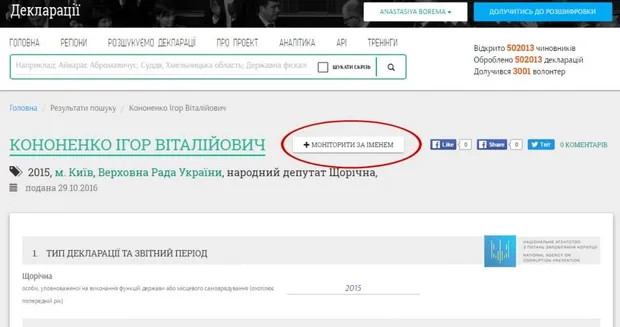 Подписаться на обновления конкретного человека можно через кнопку "мониторить по имени", которая доступна внутри каждой декларации.