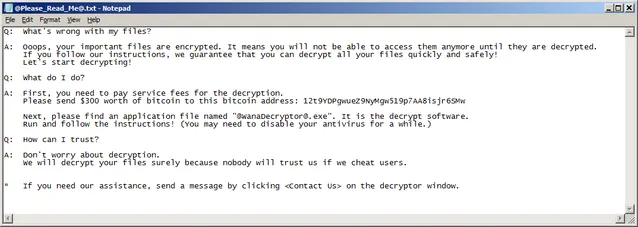• Меняют расширения пострадавших файлов в ".WNCRY" таким образом, что зараженный файл будет выглядеть примерно так: original_name_of_file.jpg.WNCRY.