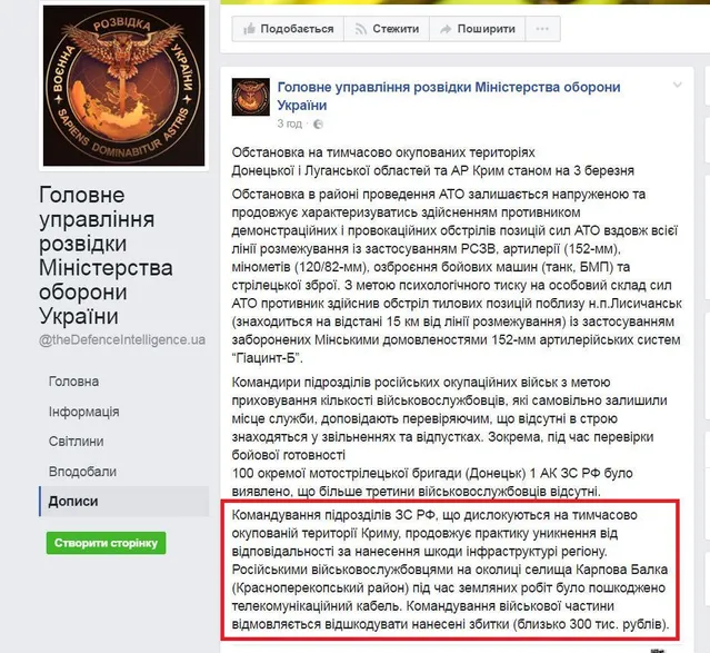 Российскими военнослужащими на окраине поселка Карпова Балка (Красноперекопский район) во время земляных работ был поврежден телекоммуникационный кабель. Командование воинской части отказывается возместить нанесенный ущерб (около 300 тыс. рублей),
