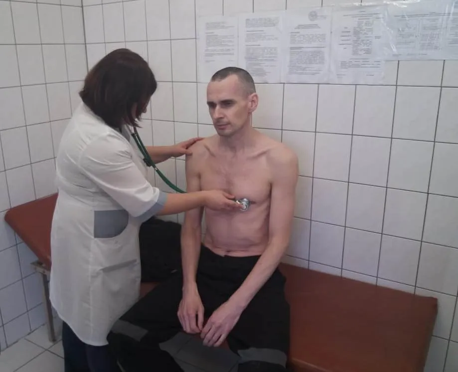 На фото видно, как похудевшего Сенцова осматривает врач.