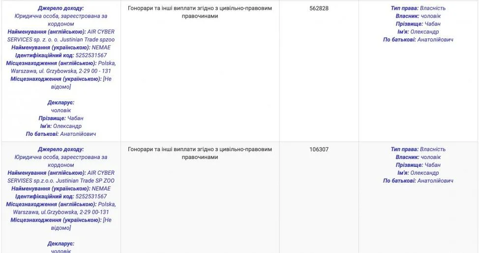 Вместе с тем, журналисты Bihus.Info выяснили, что польская фирма соратника Тимошенко и оффшорки-фигуранта дела о распиле военного контракта – заплатила миллион гривен советнику директора "Укрспецэкспорта". Выплата с пометкой "гонорар" состоялась в 2017 году. Миллион гривен от польской Air Cyber Services получил советник директора "Укрспецэкспорта" Александр Чабан.