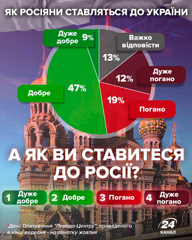 15 октября 24 канал в своем фейсбуке опубликовал инфографику, в которой приведены результаты соцопроса "Как россияне относятся к Украине?". Его провел "Левада-Центр" в конце сентября.