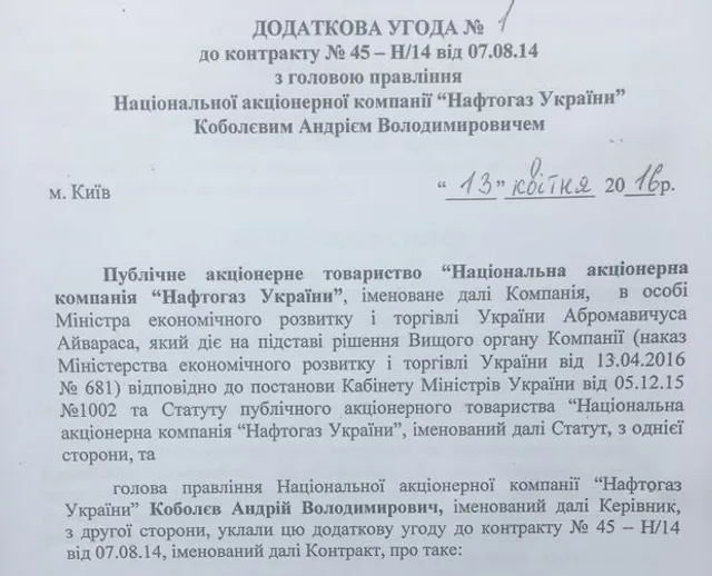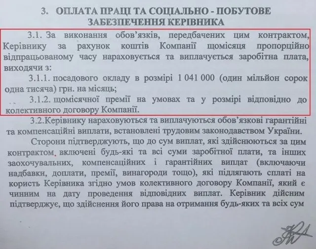 "В дополнительном соглашении к трудовому договору от 13 апреля 2016 года указывается, что кроме должностного оклада (1,041 миллиона гривен) Коболев получает ежемесячную премию "на условиях и в размере в соответствии с коллективным договором предприятия", — говорится в сообщении.