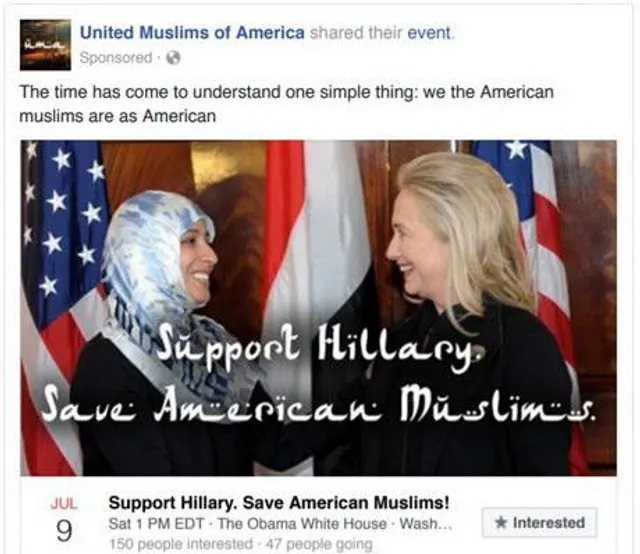Часть публикаций была направлена на разжигание межрелигиозной вражды и чтобы сыграть на антиисламских чувствах. Например, в одном из сообщений утверждалось, что мусульмане США будут рады, если победит Хиллари Клинтон.