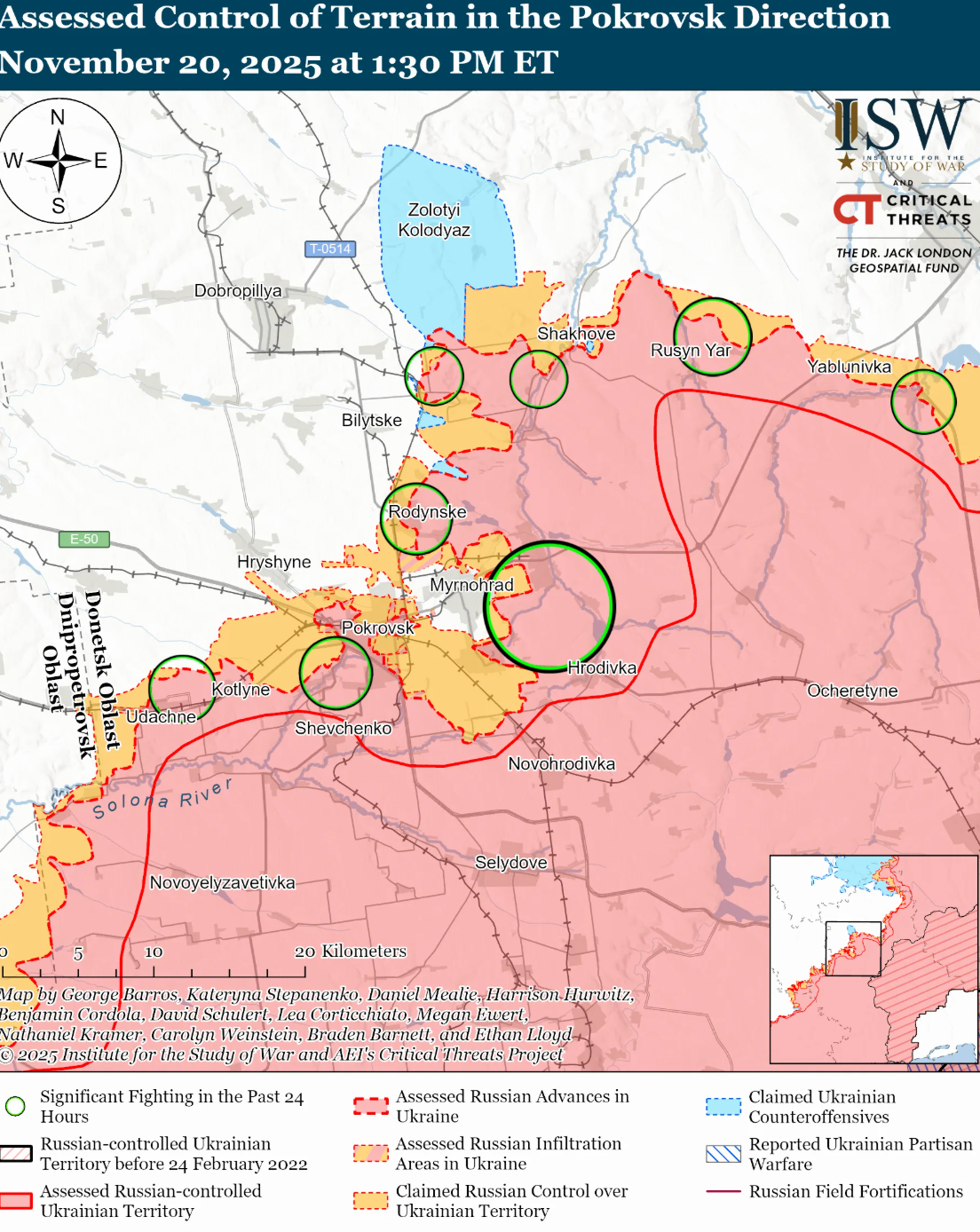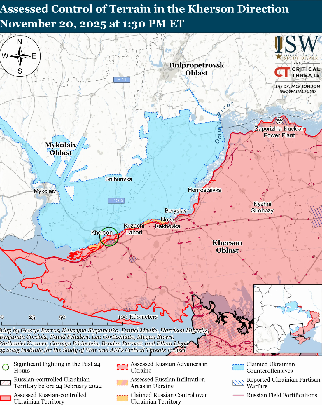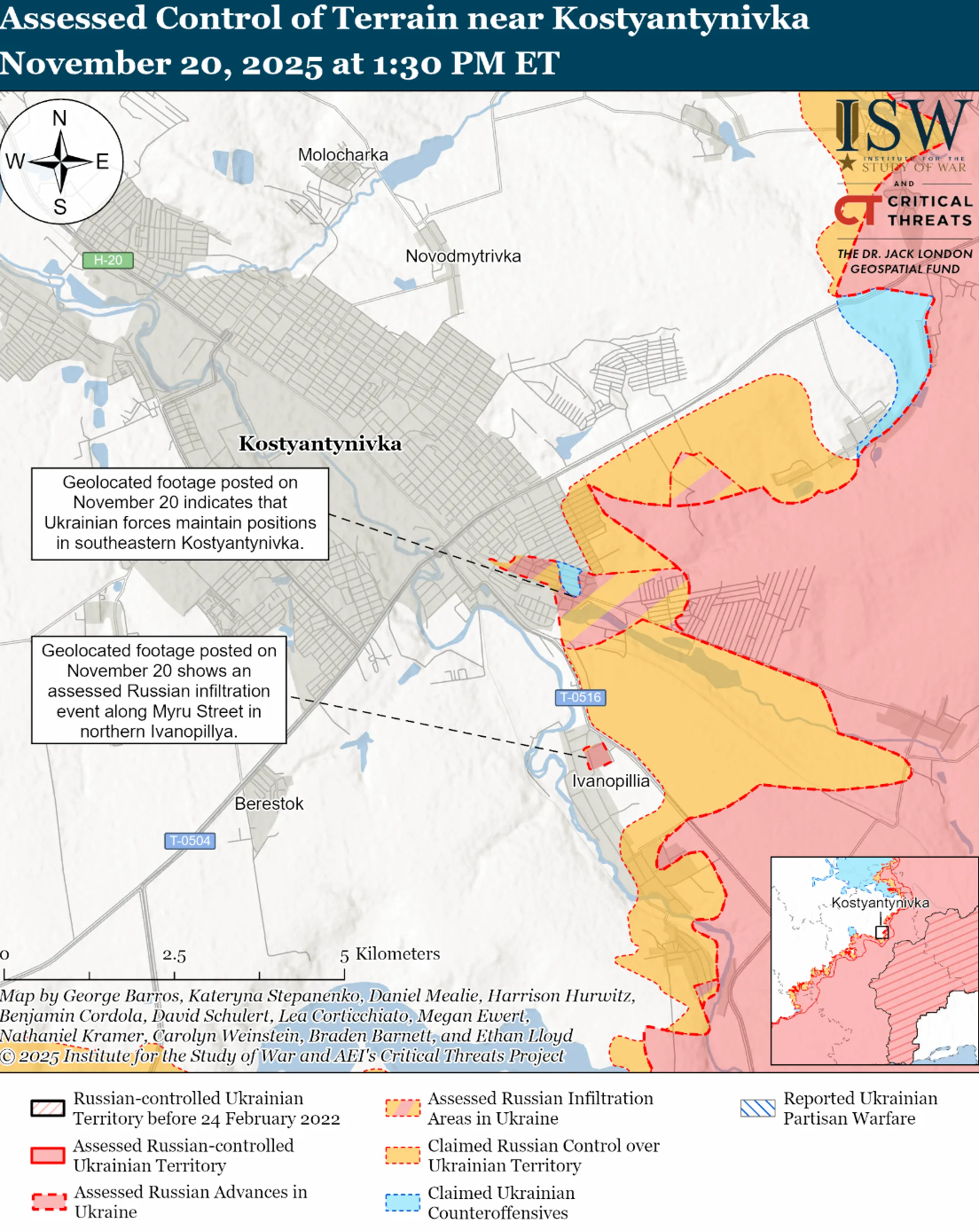- Украинские силы недавно продвинулись на тактическом направлении Константиновка-Дружковка. Видеозаписи, опубликованные 18 ноября и геолоцированные 20 ноября, свидетельствуют о том, что украинские войска продвинулись на юго-восток Константиновки.