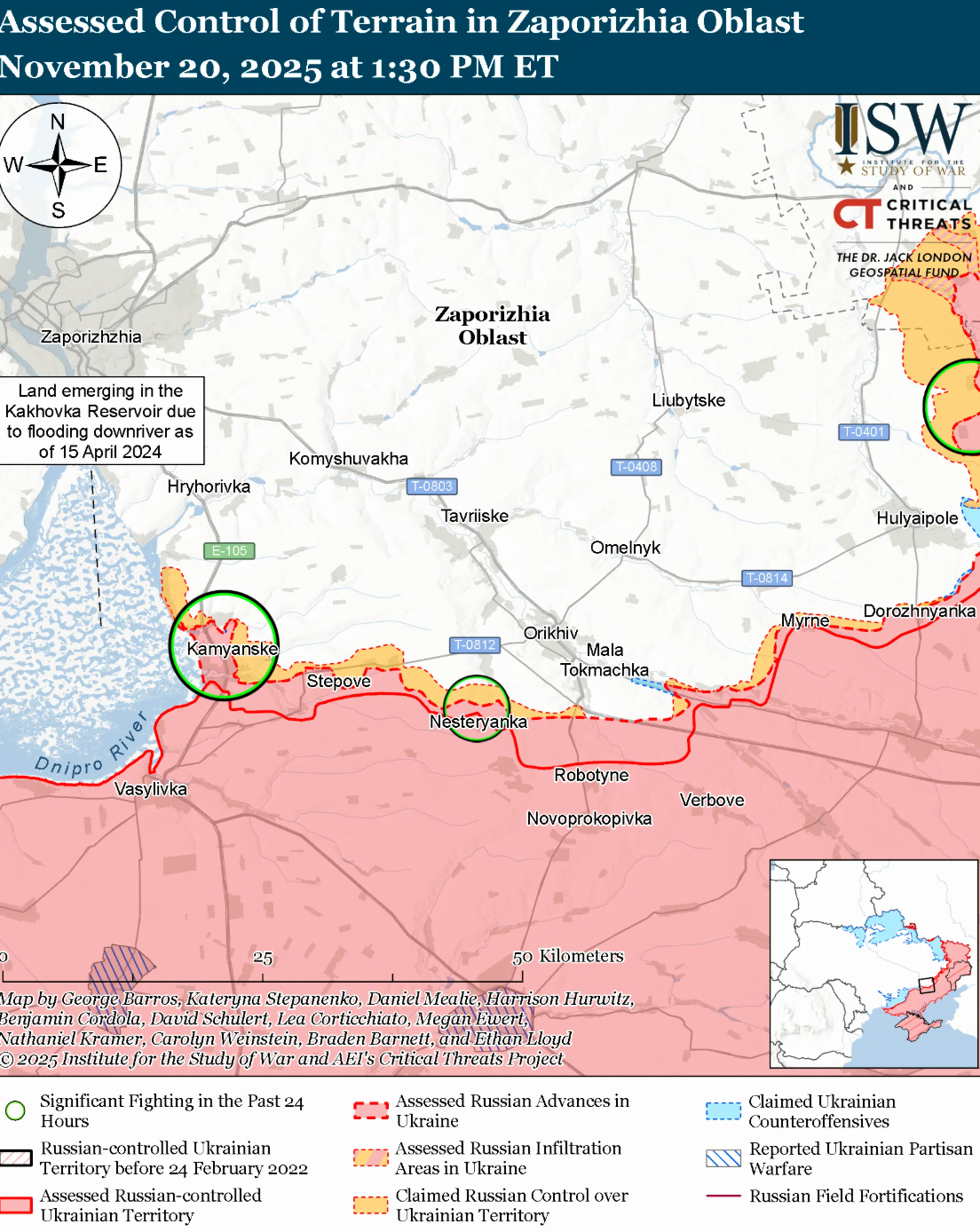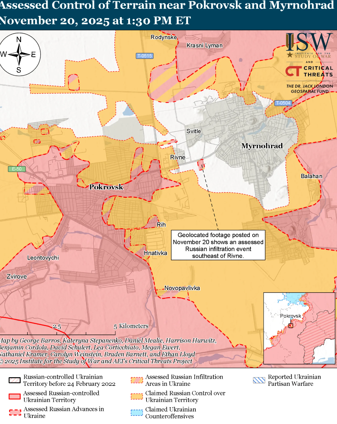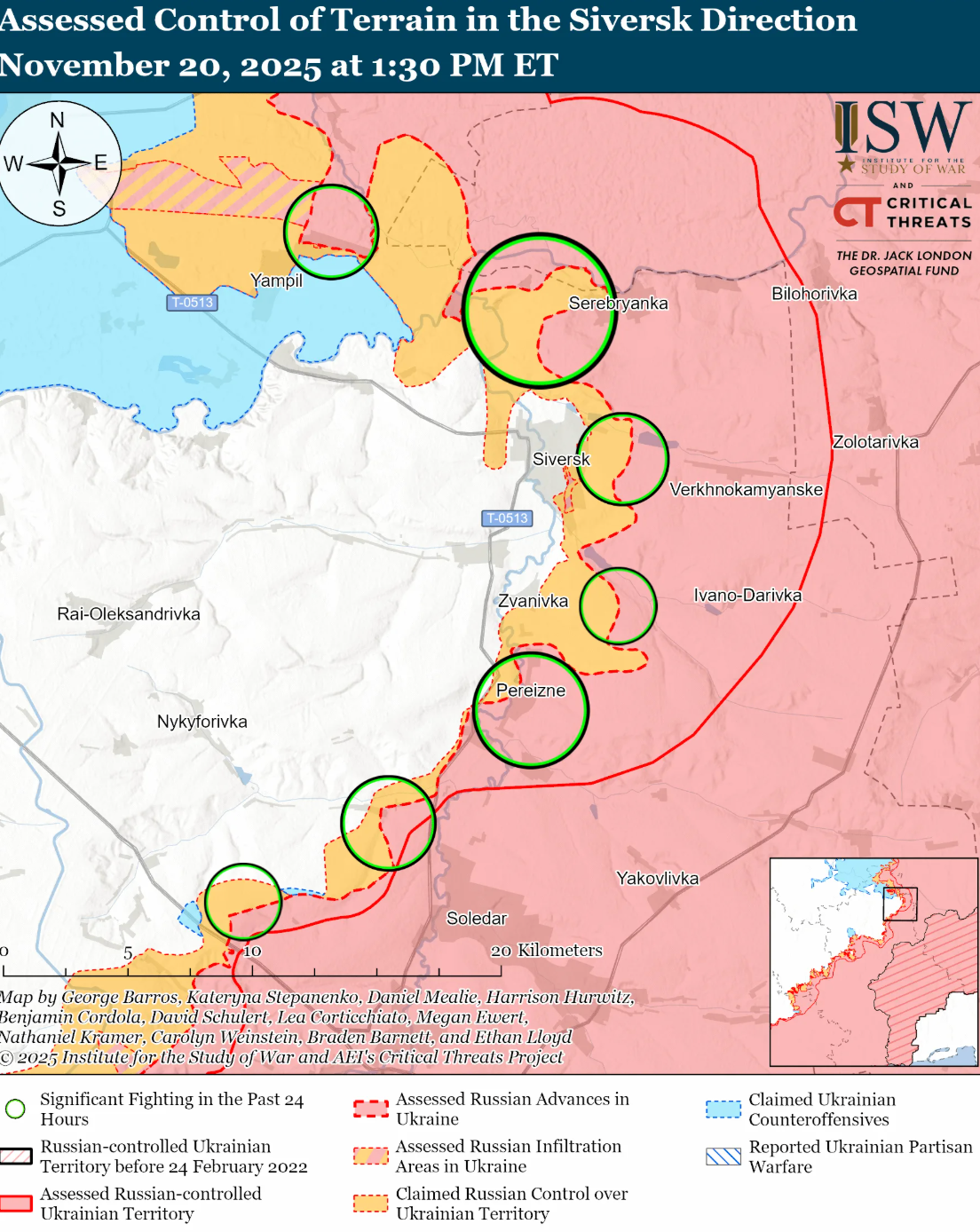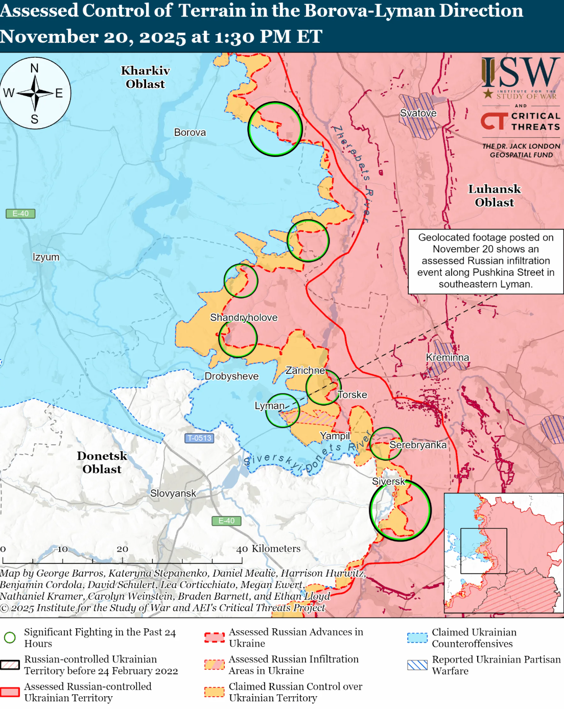 - Украинские силы недавно продвинулись на тактическом направлении Константиновка-Дружковка. Видеозаписи, опубликованные 18 ноября и геолоцированные 20 ноября, свидетельствуют о том, что украинские войска продвинулись на юго-восток Константиновки.