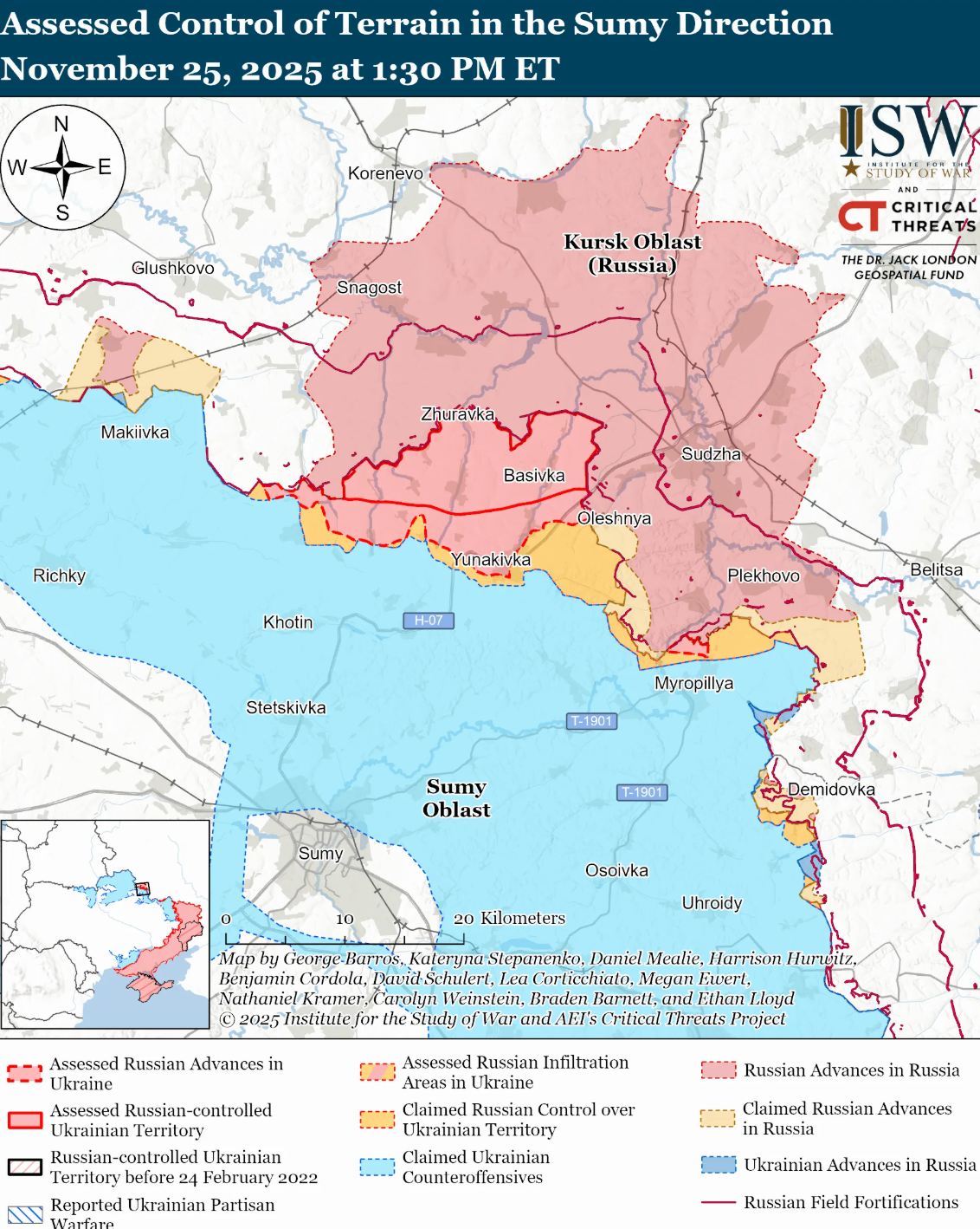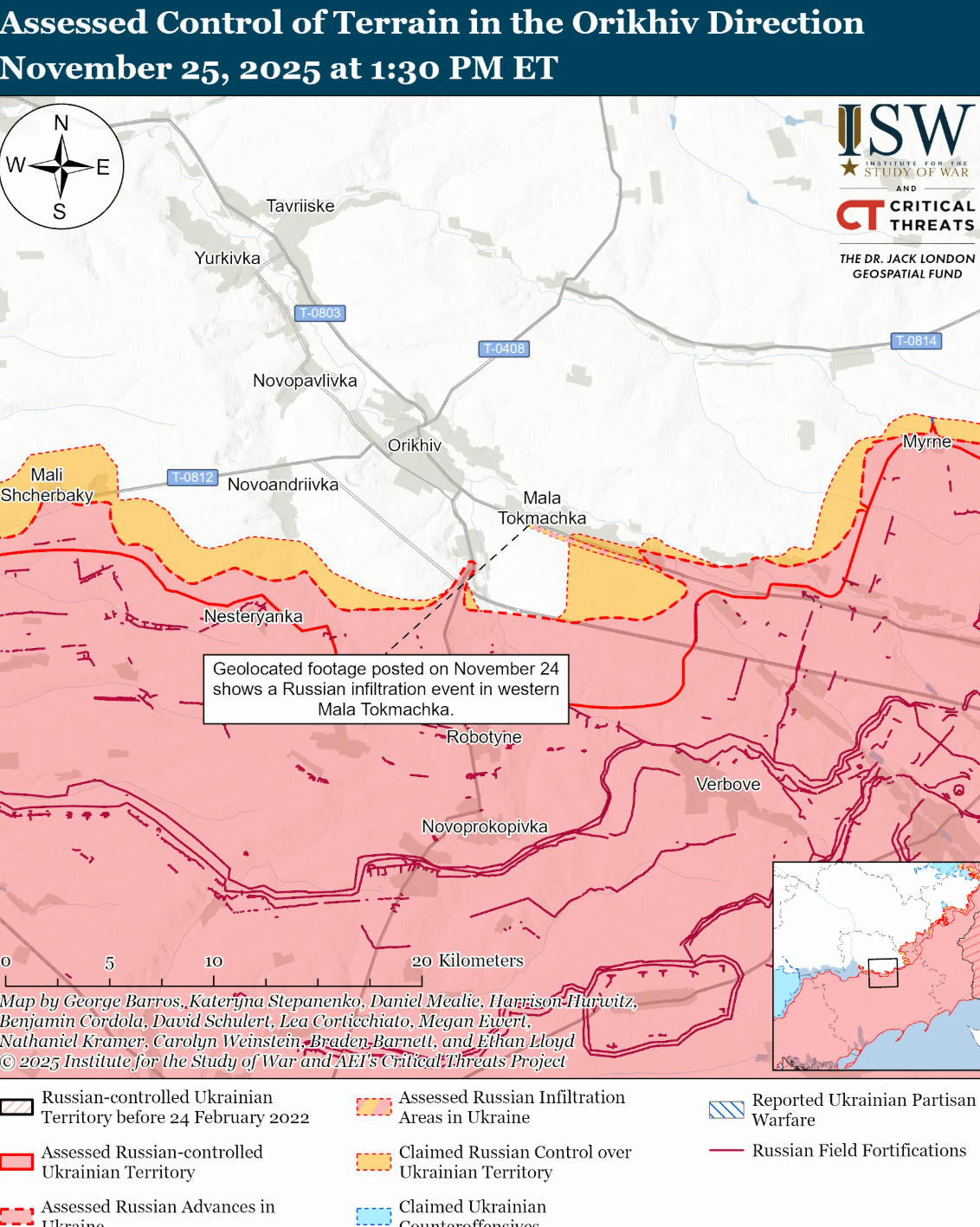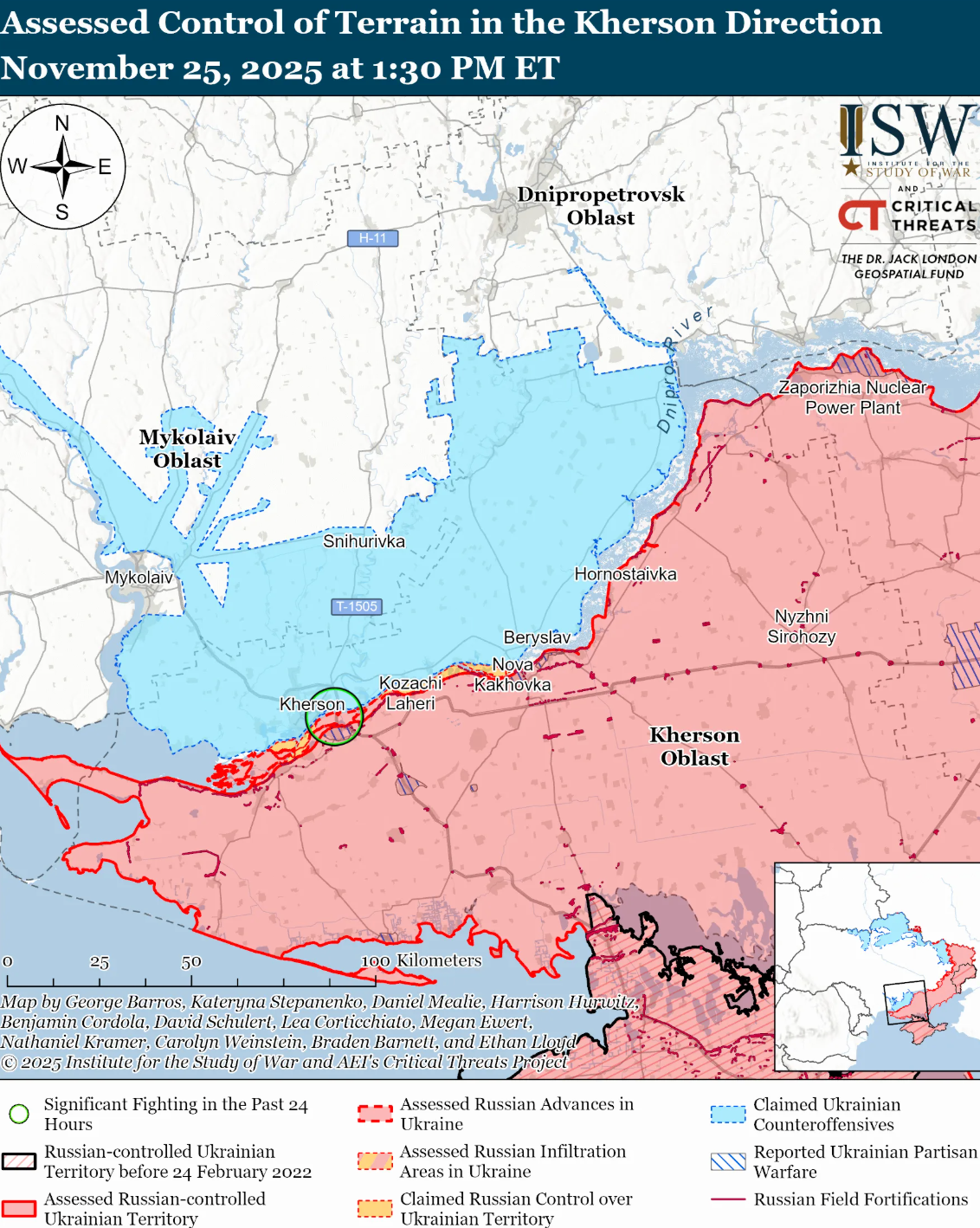 - Российские войска продолжали ограниченные наземные атаки к востоку от Херсона вблизи Антоновского моста, но не продвинулись вперед.