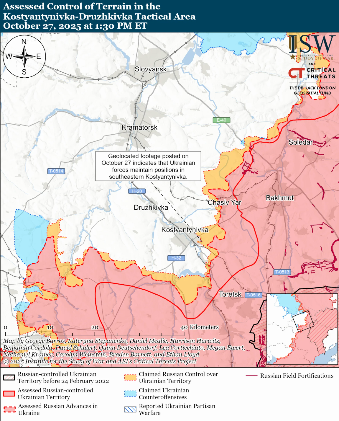 Украинская армия удерживала позиции или недавно продвинулась в тактическом районе Константиновка-Дружковка. Геолокационные видеозаписи, опубликованные 27 октября, указывают на то, что ВСУ удерживают позиции на юго-востоке Константиновки, в районе, где, по предварительным данным российских источников, сохранялось присутствие оккупантов.