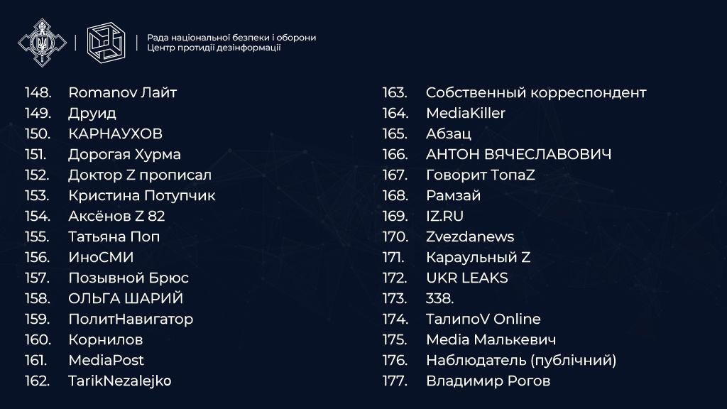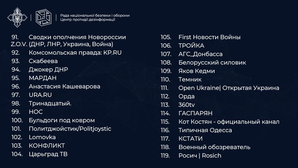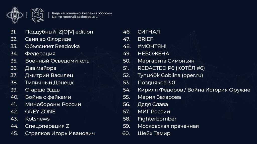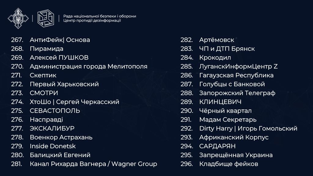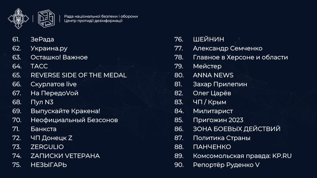 В Центре противодействия дезинформации отметили, что оба списка создали 11 марта 2024 года. В полный список безопасных источников информации в телеграме, куда вошли 125 каналов, включили официальные телеграм-каналы украинской власти, военного командования и формирований, руководителей областных государственных администраций, а также ряд государственных организаций и государственные информационные агентства.