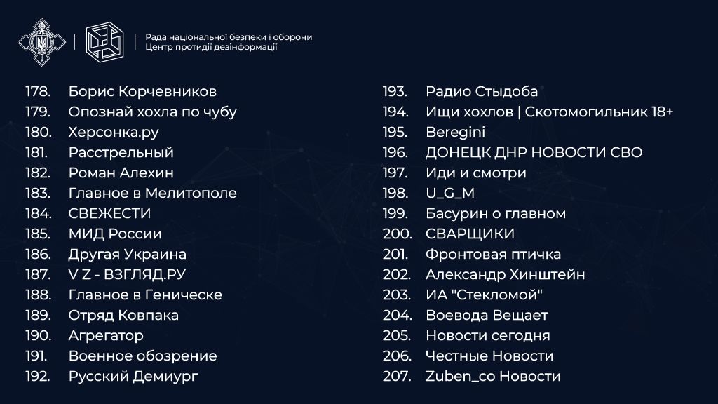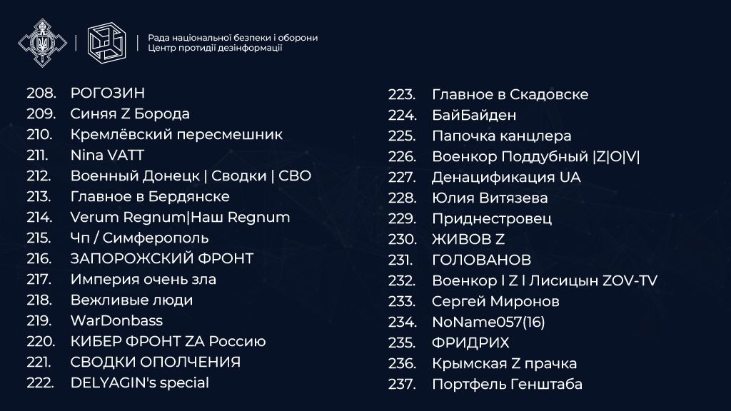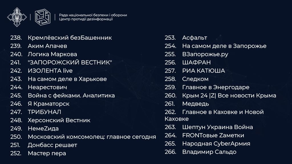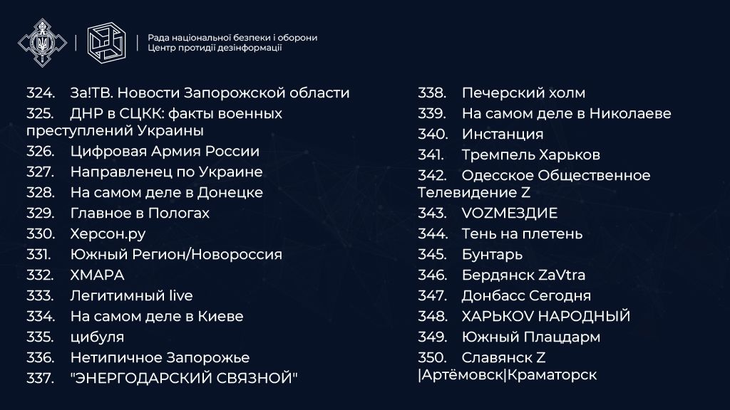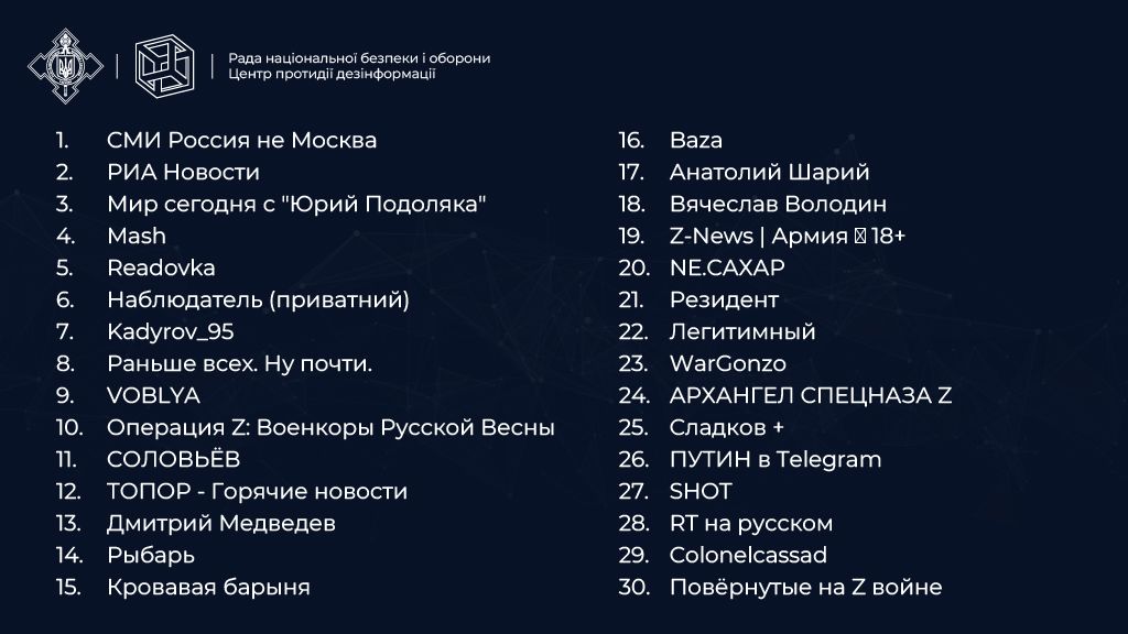 В то же время Центр противодействия дезинформации совместно с Кибердепартаментом СБУ создали список из 355 телеграм-каналов, которых следует избегать и отписаться, если еще почему-то этого не сделали. Ведь в этих каналах враг распространяет дезинформацию и открытые фейки в отношении нашего государства.