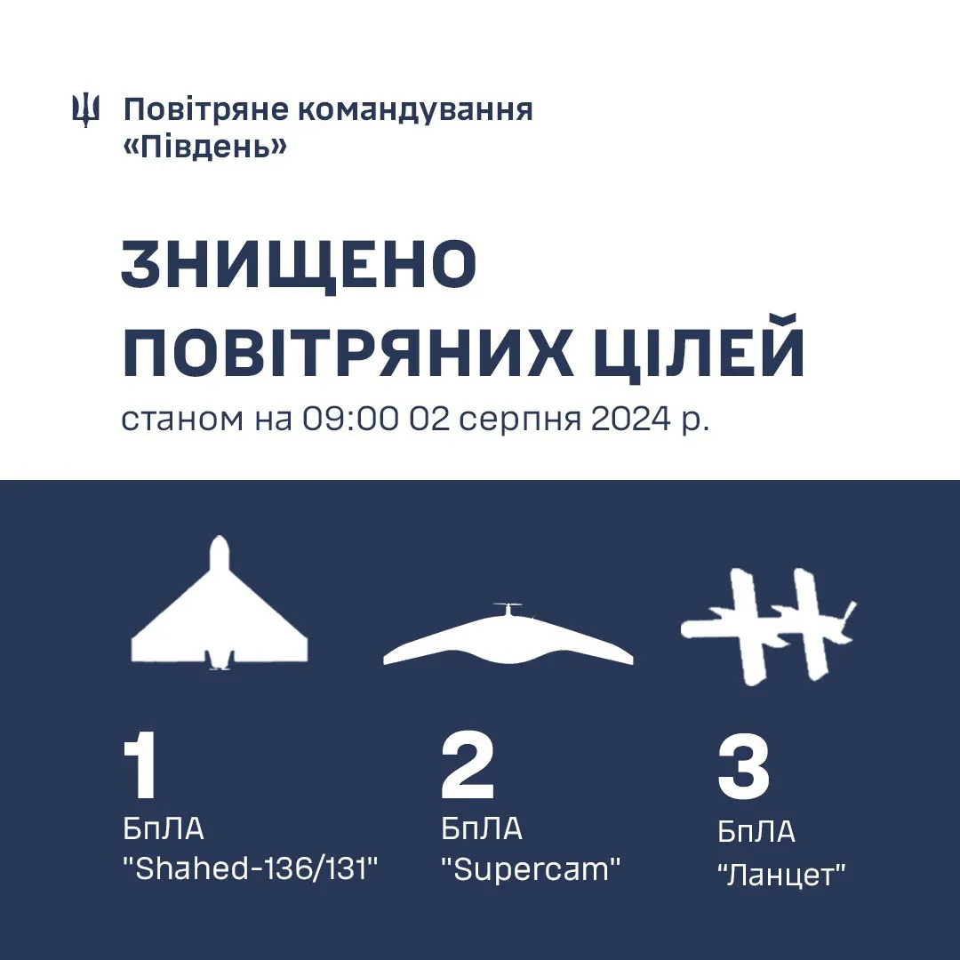В частности, силы ПВО на южном направлении уничтожили один ударный беспилотник типа Shahed 136/131, 2 БПЛА типа Supercam, а также 3 дрона типа "Ланцет".