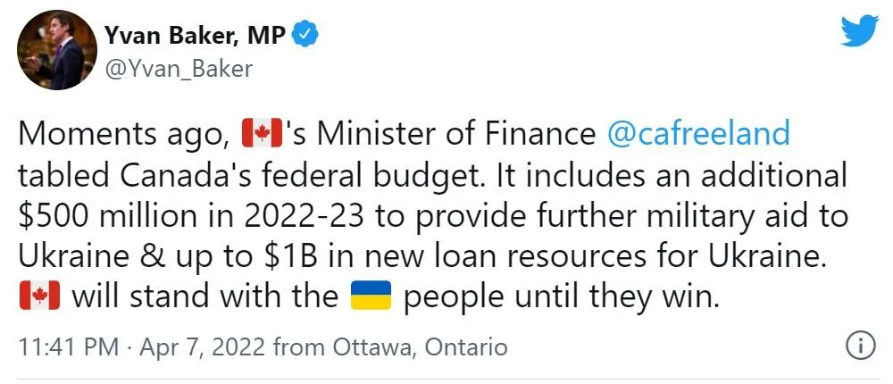 По словам Бейкера, министр финансов Канады подал федеральный бюджет в этот день. Речь идет о расходах страны в течение 2022 – 2023 годов.