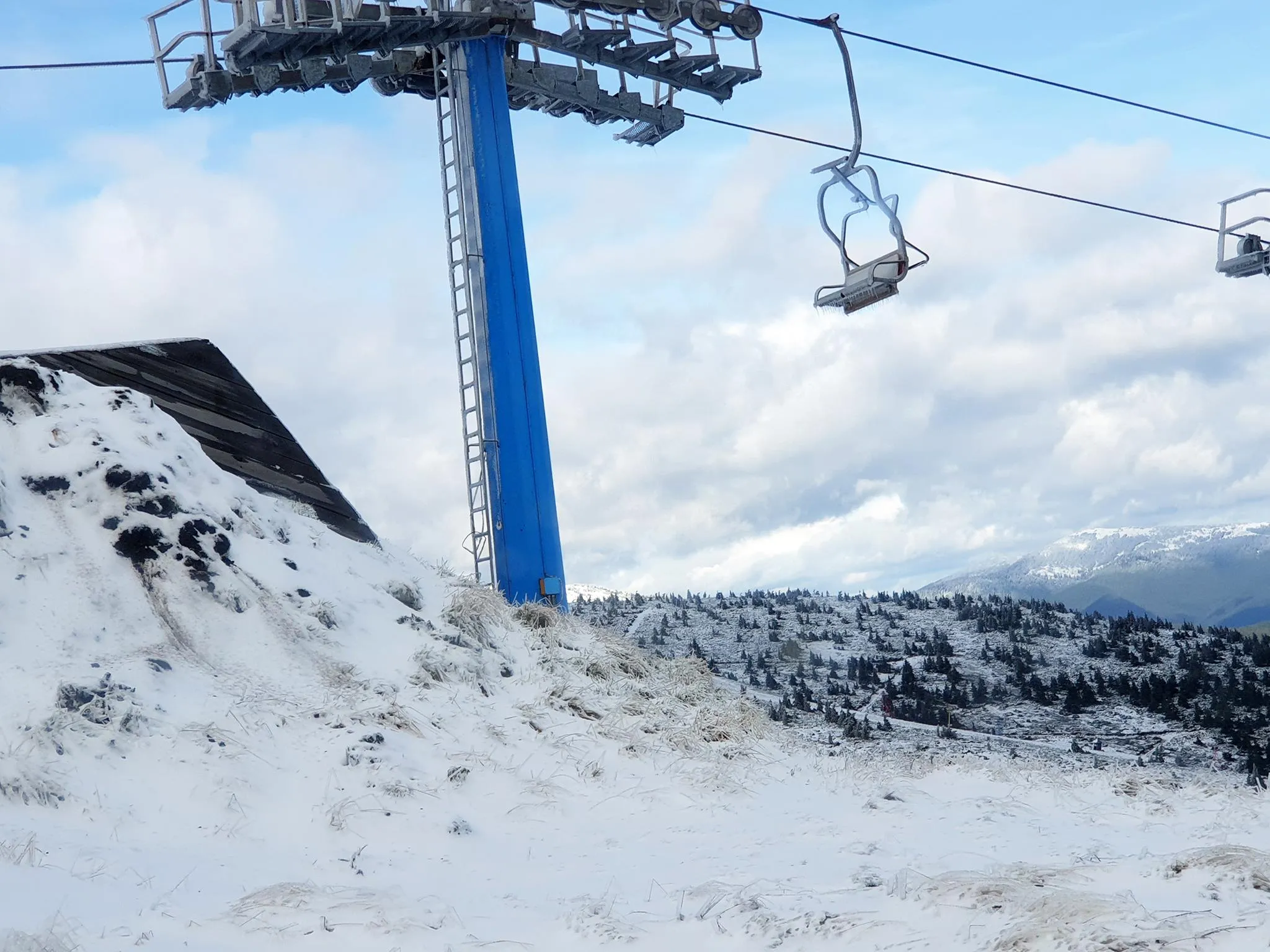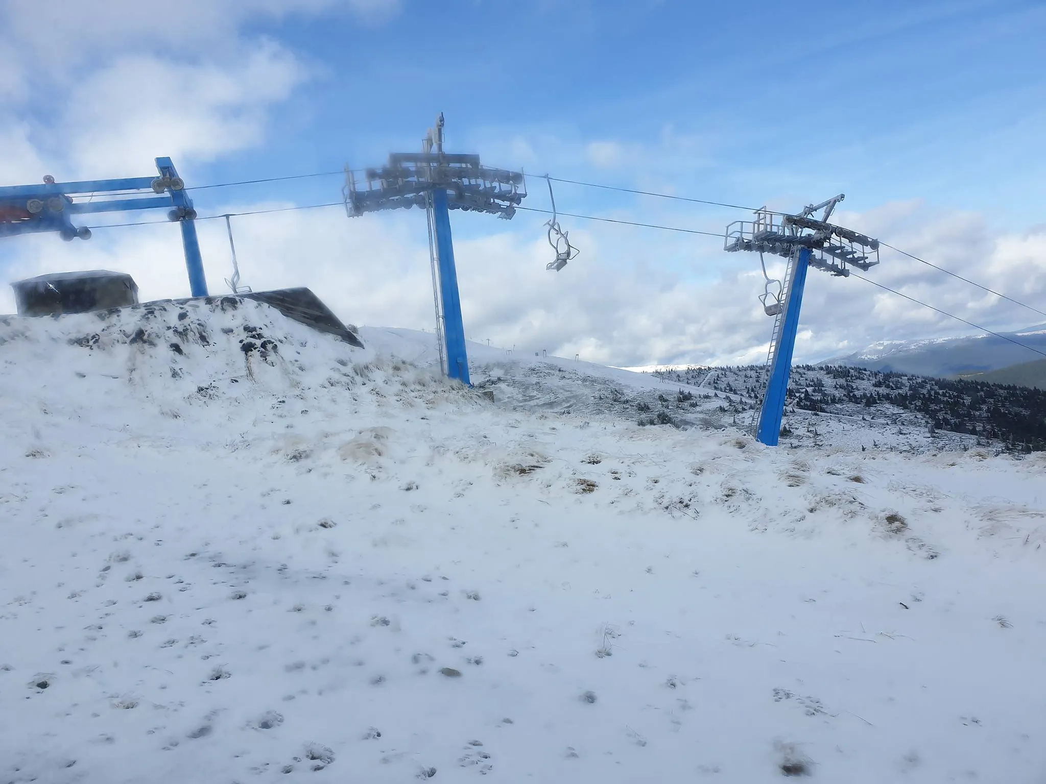 Как видно на фотографиях, верхушки гор покрыты несколькосантиметровым снежным покровом. Кроме того, на некоторых из сидений подъемника образовались сосульки.