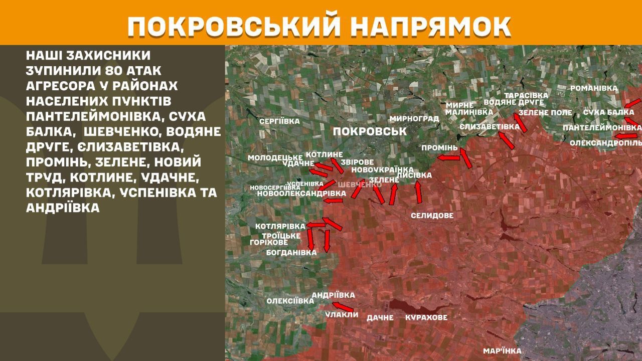 На Покровском направлении наши защитники остановили 80 атак российских захватчиков в районах населенных пунктов Пантелеймоновка, Сухая Балка, Шевченко, Водяное Второе, Елизаветовка, Проминь, Зеленое, Новый Труд, Котлино, Удачное, Котляровка, Успеновка и Андреевка.